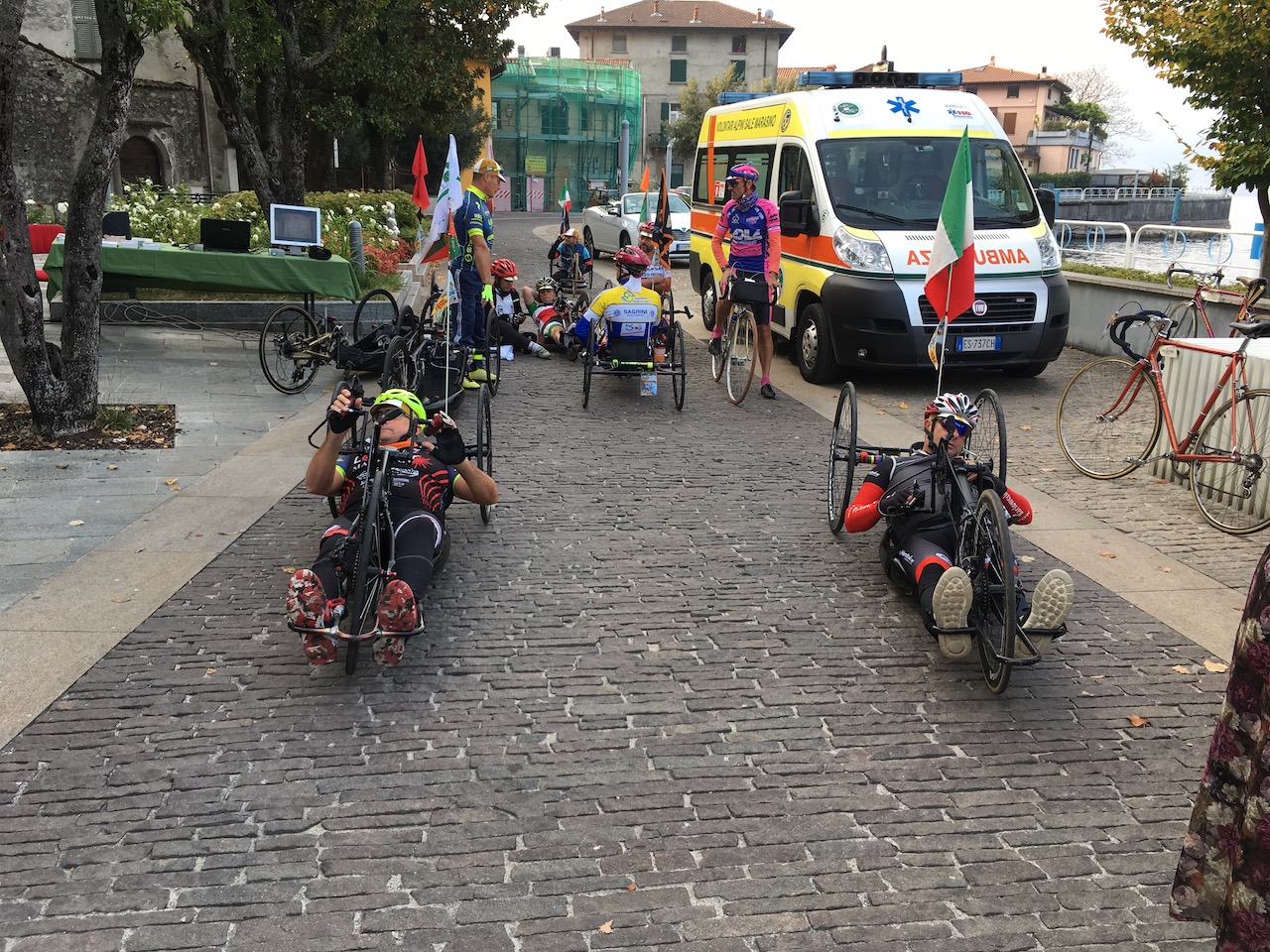 Register (pre booked on the internet) at the ride HQ to be given a large envelope with A4 poster, cap and other bits and bobs. Problem, what do I do with that? Decide the only thing to do is to cycle back up the hill to leave them in the house! Easier this time without luggage, then freewheel down again and directed into the start area, a square between the lake and the church. A band playing, lots of shouting and its time to go with the band playing the Italian national anthem and many riders singing.