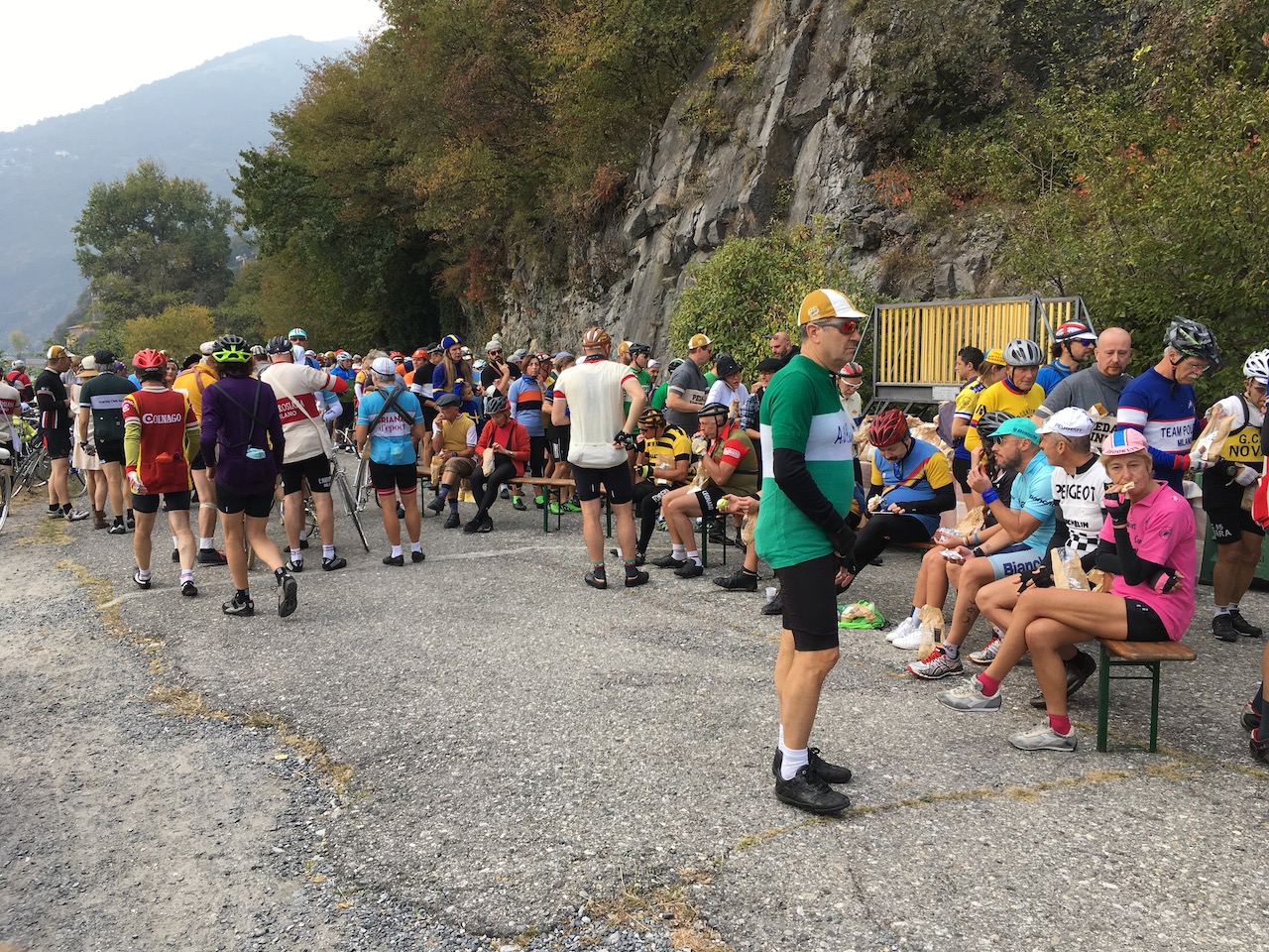 After the last stop the route left the road and used what I presume was the original road which is now a ‘shared’ path, quite a few ‘non event’ cyclists trying to go in the opposite direction which was a bit of a forlorn hope. Eventually we arrived back in Marone and were funnelled into a large garden behind the ride HQ and all given pasta, bruschetta and red wine. The weather couldn’t have been better, weak sun shining through high cloud, about 20 degrees which of course really made the day. It was really well organised, everyone very friendly, I speak virtually no Italian and never heard any other language all day but it didn’t matter I just followed everyone else!